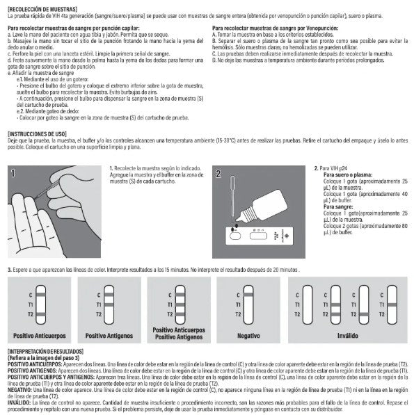 Es una prueba rápida basada en inmunocromatografía de flujo lateral con interpretación visual que detecta cualitativamente antigeno de VIH 1 (p24) en suero/plasma/sangre total. Agente de diagnóstico para uso in vitro. Para uso exclusivo de laboratorios clínicos o de gabinete.